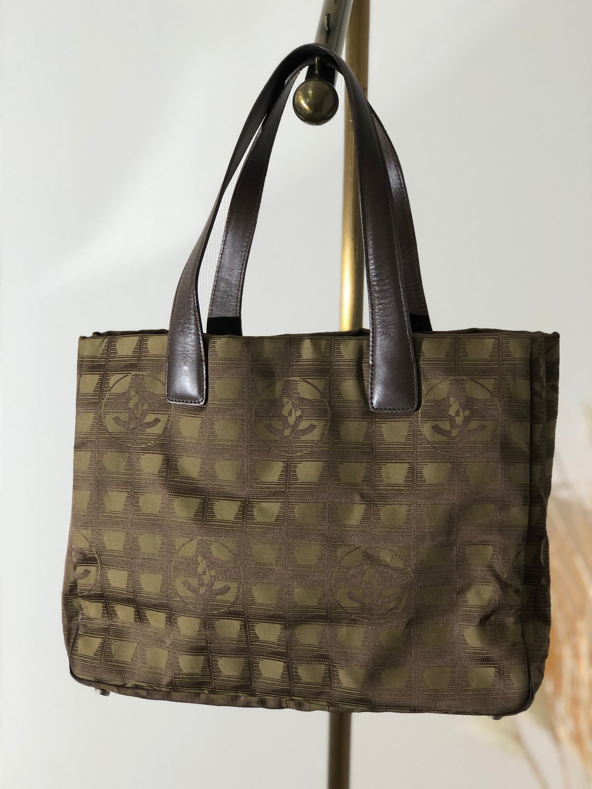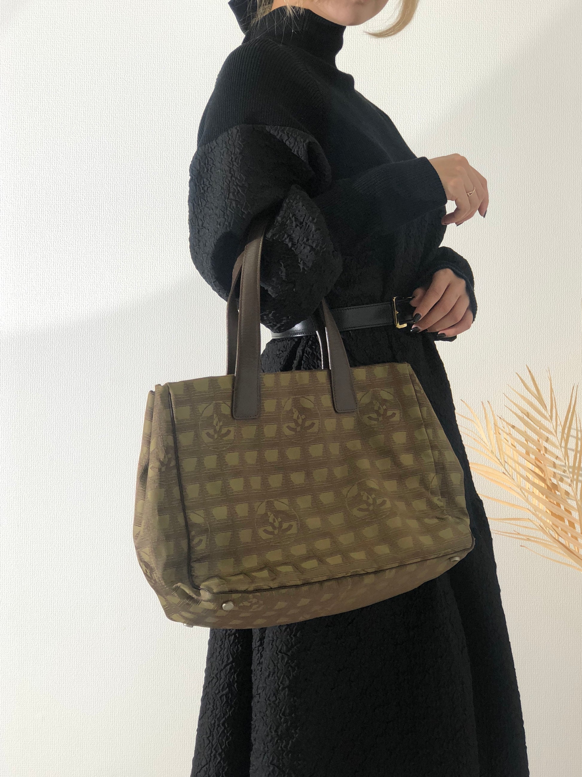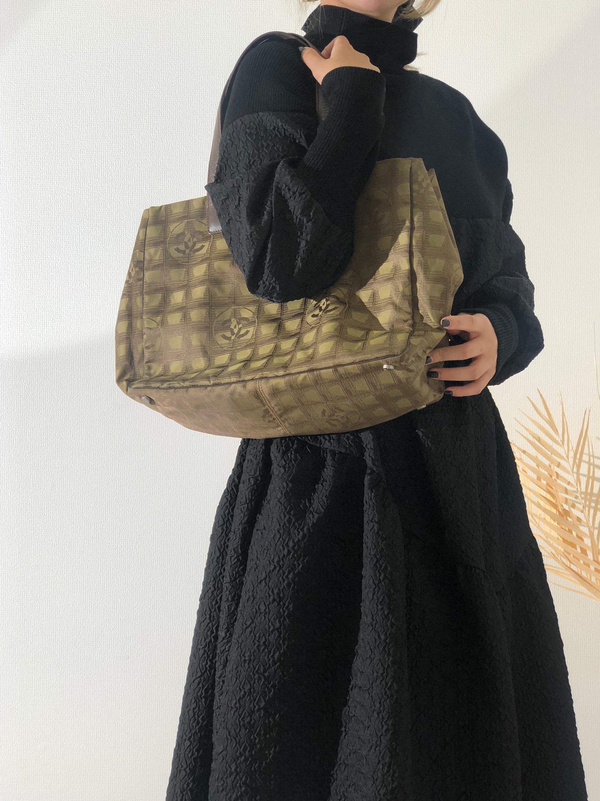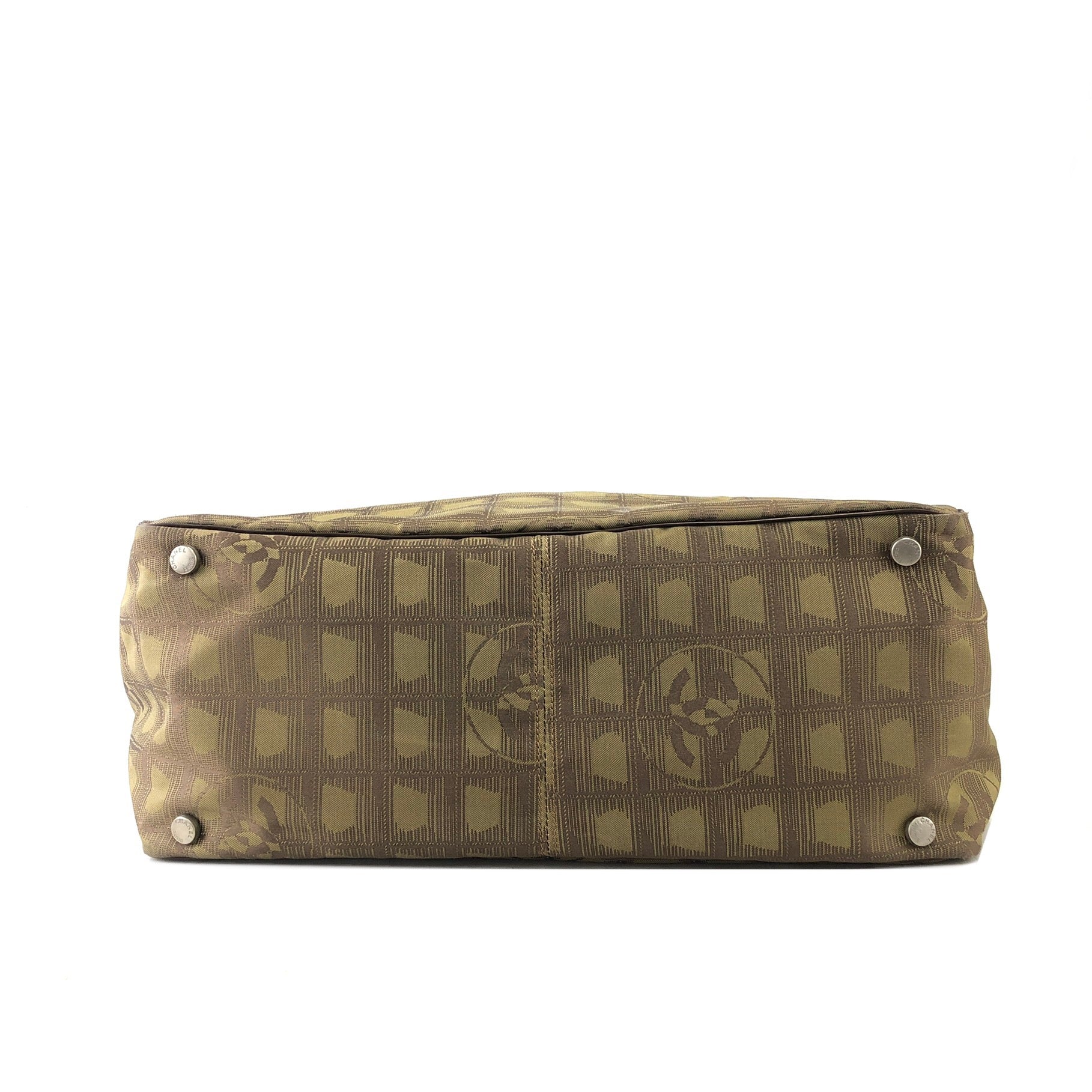 CHANEL New Travel Line Nylon Handbag Totebag Khaki Vintage hvx4g4