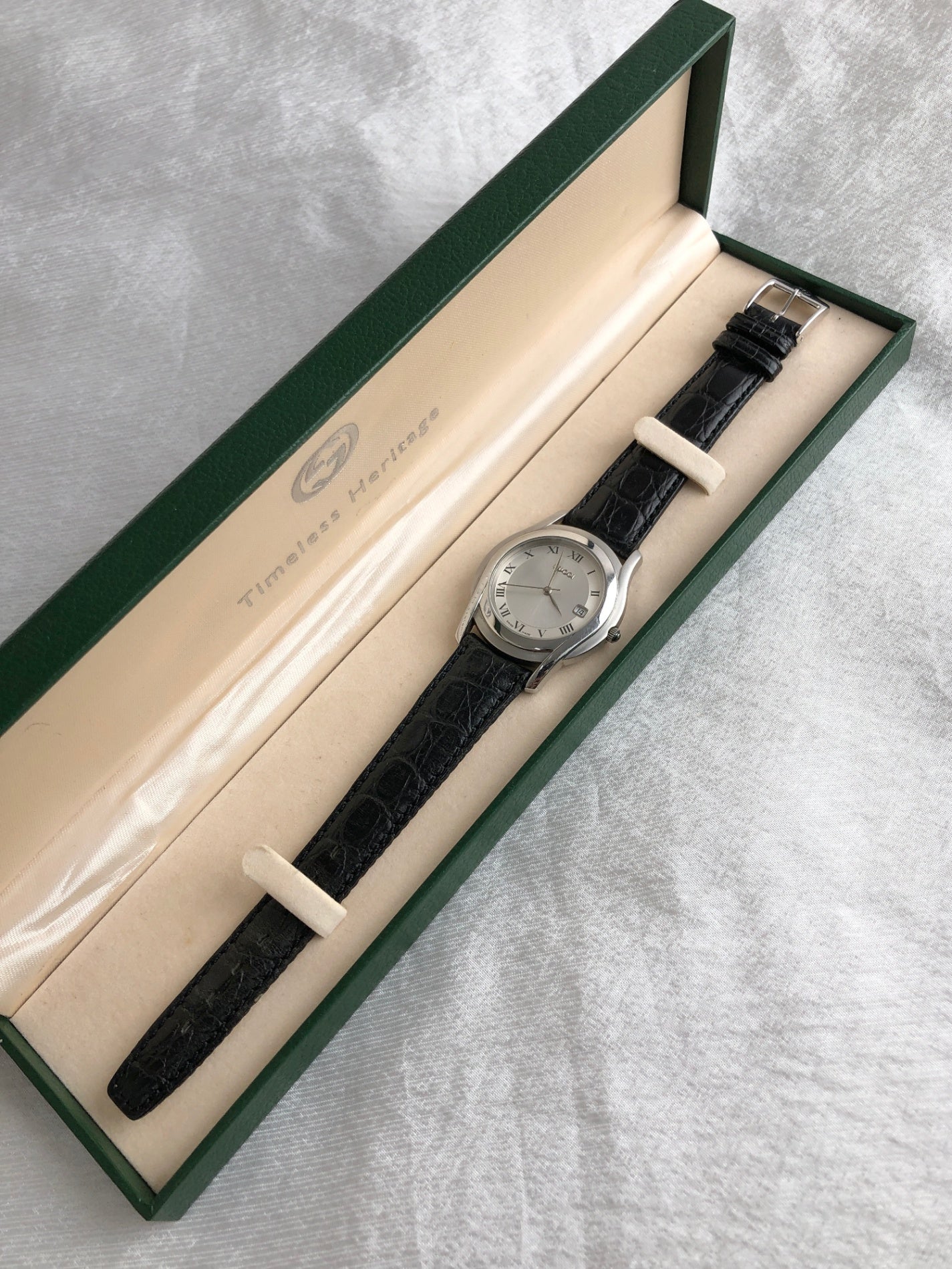 GUCCI Logo Watch Silver×Black 5500M Vintage 24mgta